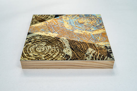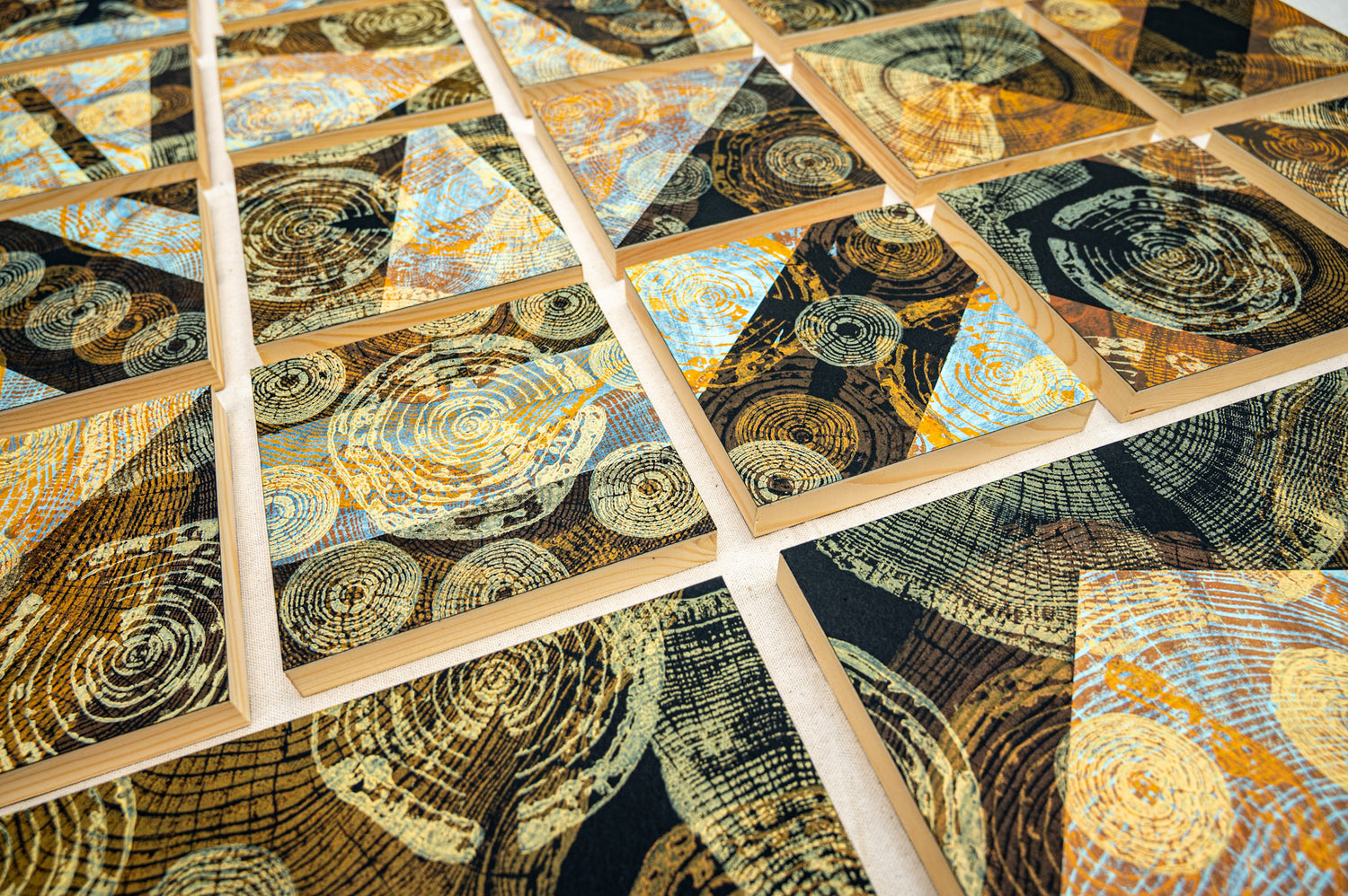 Original hand made relief block prints created using downed or felled tree cross sections, preserving the history and memory of the natural landscape around us.
