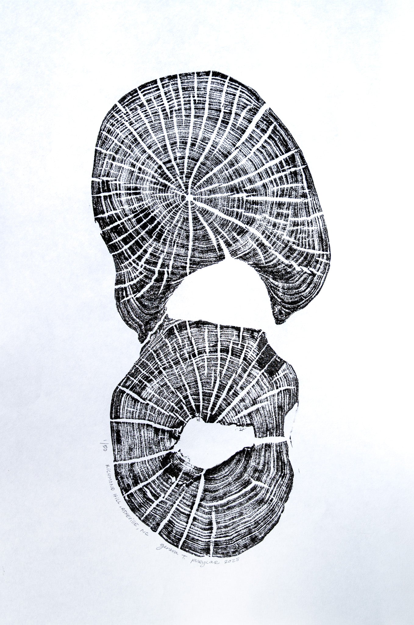 ‘Double - Richmond Hill, Asheville, NC’ is a hand-pressed tree ring ink impression made from the end grain of a downed double trunk tree found in the woods of the Richmond Hill disc golf course in Asheville, NC. Each print in this edition is a hand-pulled ink rubbing printed on archival Japanese Masa paper using traditional block printing methods and are each considered original works of art, not digital reproductions. Due to the nature of printmaking by hand, slight variations or nuances may exist from one print to another. This is to be expected and demonstrates the true nature printmaking and of an original handmade artwork.