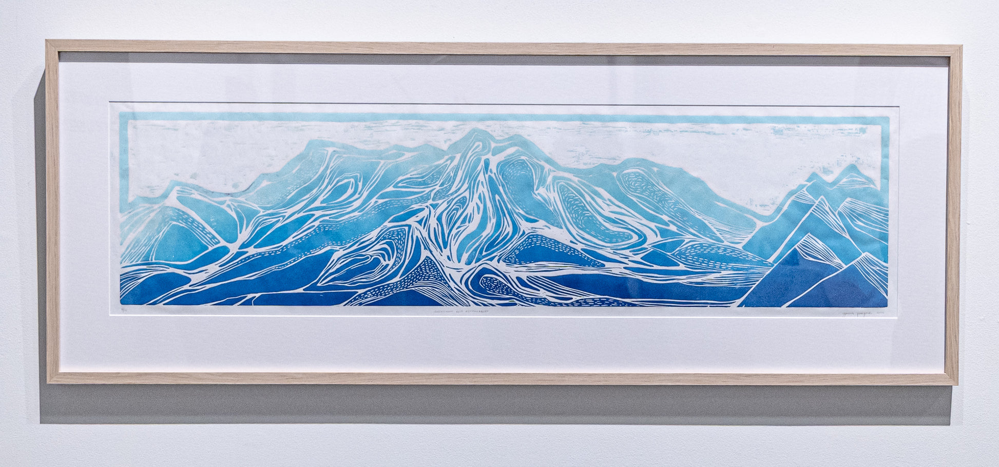 Blue Remarkables es una impresión en relieve xilográfica original hecha a mano impresa en delicado papel japonés Masa de archivo. Esta impresión se inspiró en la cadena montañosa "Remarkables" que vio el artista durante su visita a Queenstown, Nueva Zelanda, que es solo una de las dos cadenas montañosas en la Tierra que corren directamente de norte a sur. Cada impresión de esta serie de edición limitada está firmada, numerada y fechada.