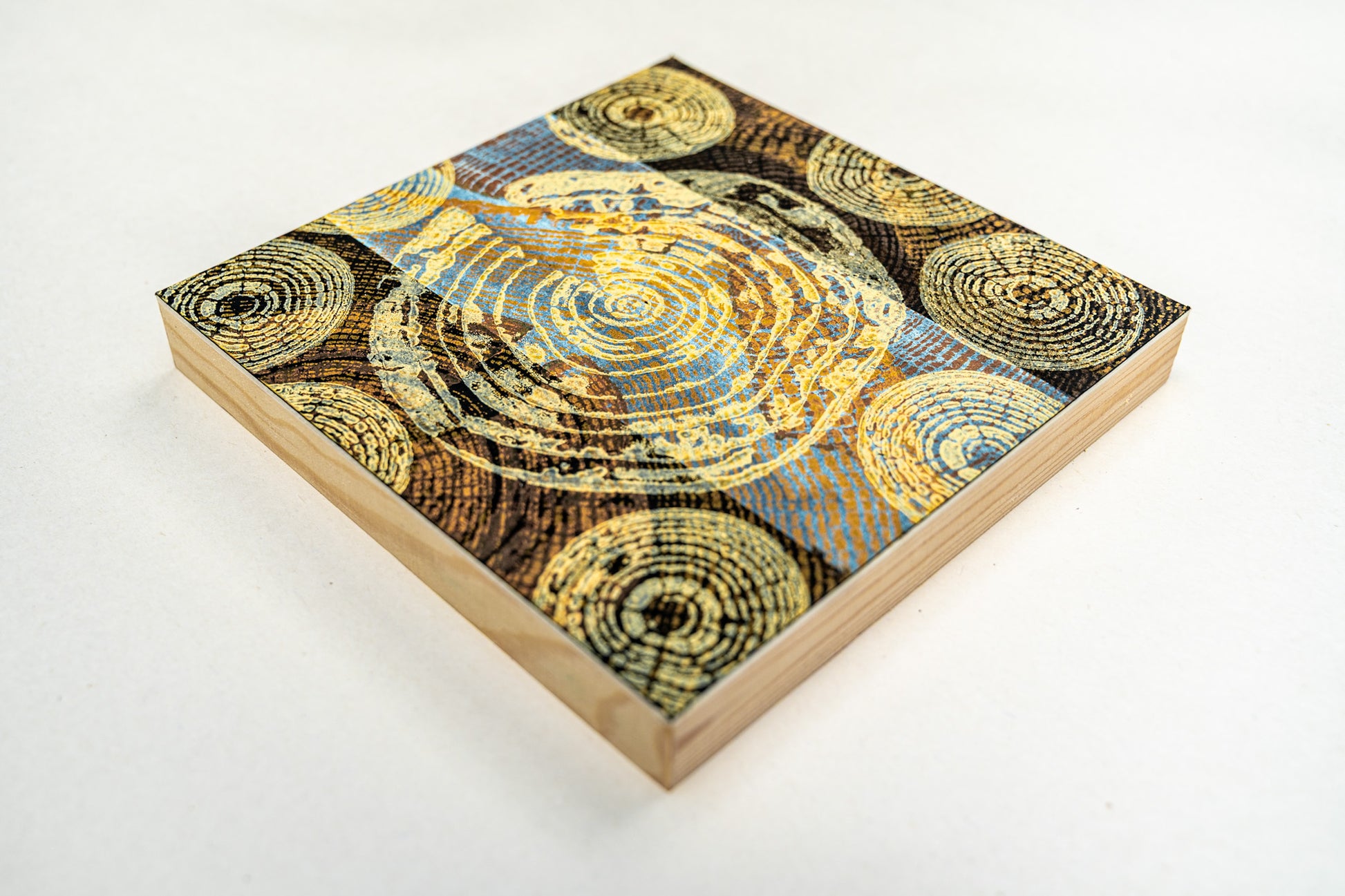 Each piece in the Summer Series is a one-of-a-kind original monoprint, hand printed from the cross-section of downed trees. These works repurpose the natural imagery of tree rings into layered abstract compositions, merging traditional printmaking with contemporary design. Inspired by the Bauhaus art movement and folk art traditions, this collection celebrates color, form, and the enduring beauty found in nature’s patterns.