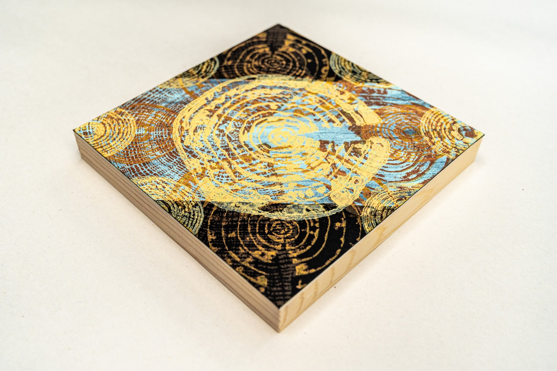 Each piece in the Summer Series is a one-of-a-kind original monoprint, hand printed from the cross-section of downed trees. These works repurpose the natural imagery of tree rings into layered abstract compositions, merging traditional printmaking with contemporary design. Inspired by the Bauhaus art movement and folk art traditions, this collection celebrates color, form, and the enduring beauty found in nature’s patterns.