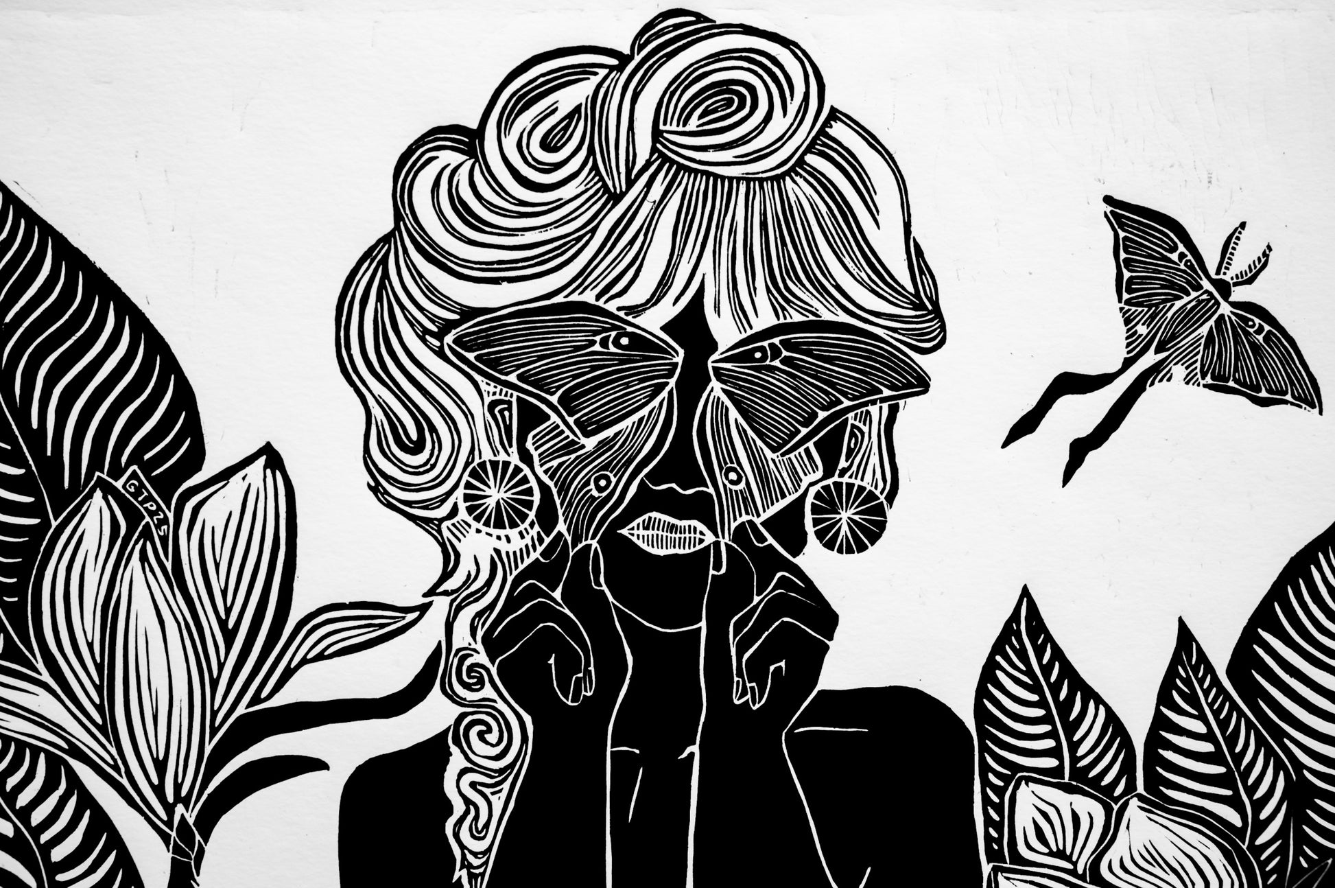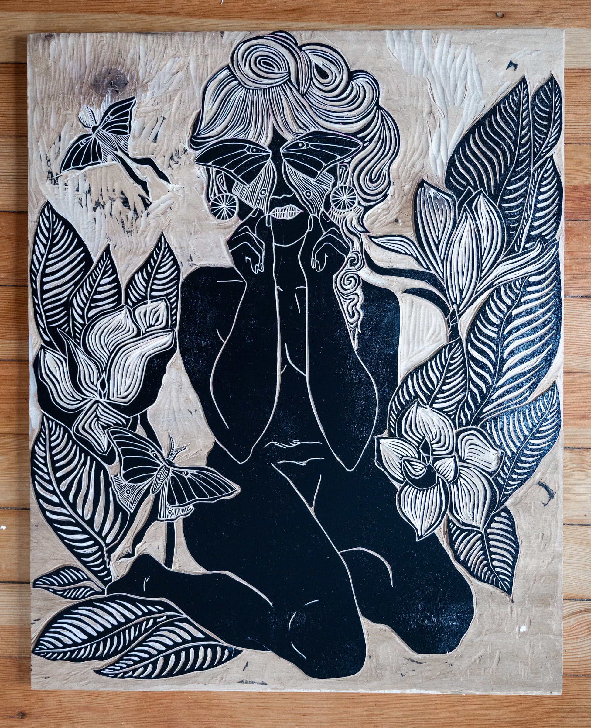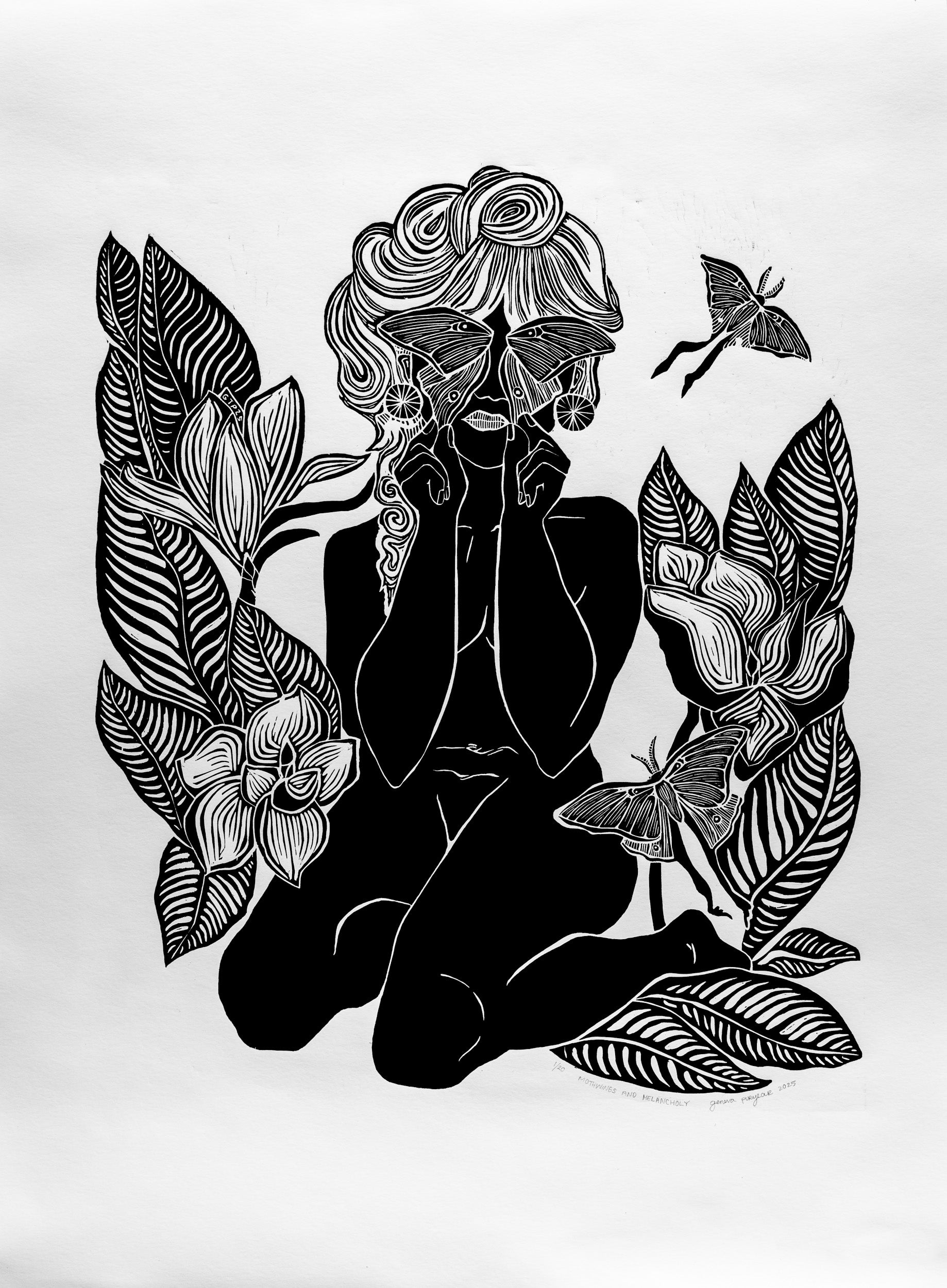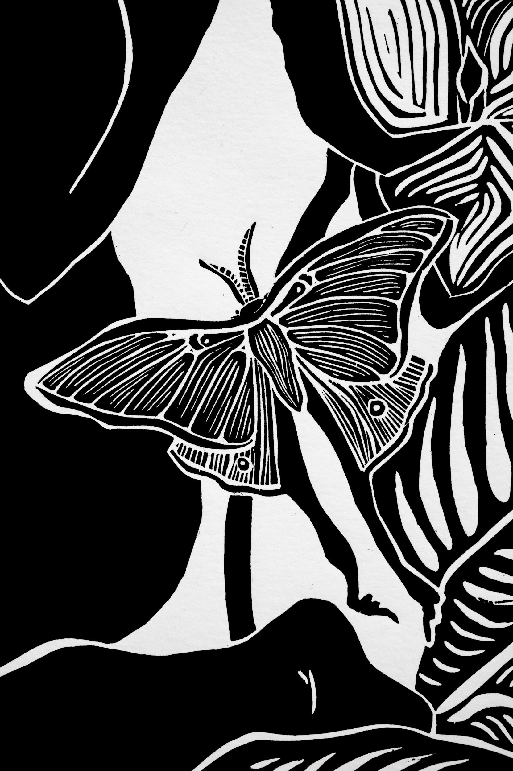 ‘Moth Wings and Melancholy’ is an original woodblock print inspired by my first summer of the pandemic and our human connection to nature. Each print is hand inked and pressed using traditional relief printmaking methods. Due to the nature of handmade printmaking, no two prints are exactly alike - small variations make each one unique.