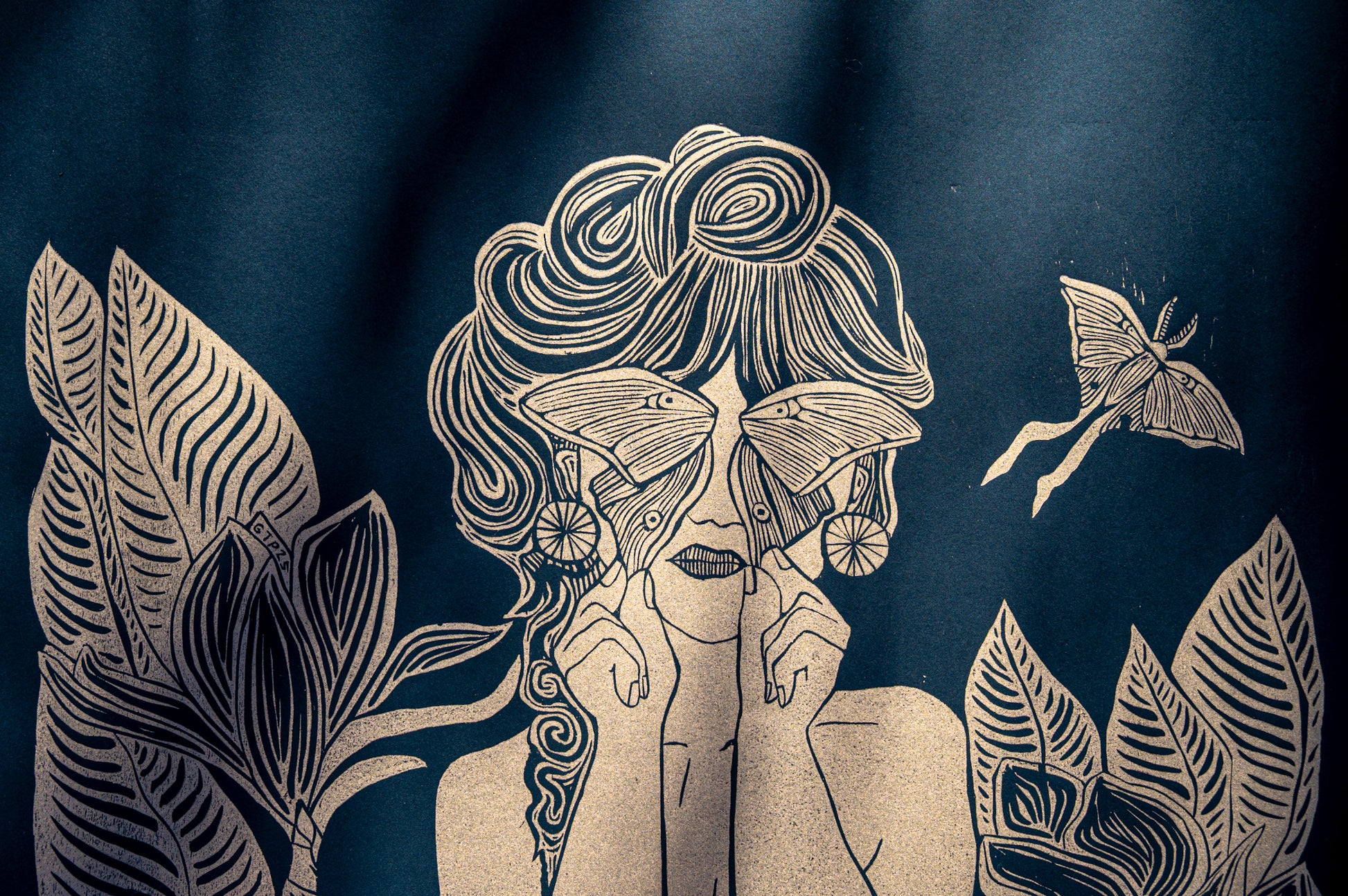 ‘Moth Wings and Melancholy’ is an original woodblock print inspired by my first summer of the pandemic and our human connection to nature. Each print is hand inked and pressed using traditional relief printmaking methods. Due to the nature of handmade printmaking, no two prints are exactly alike - small variations are to be expected and make each one unique.